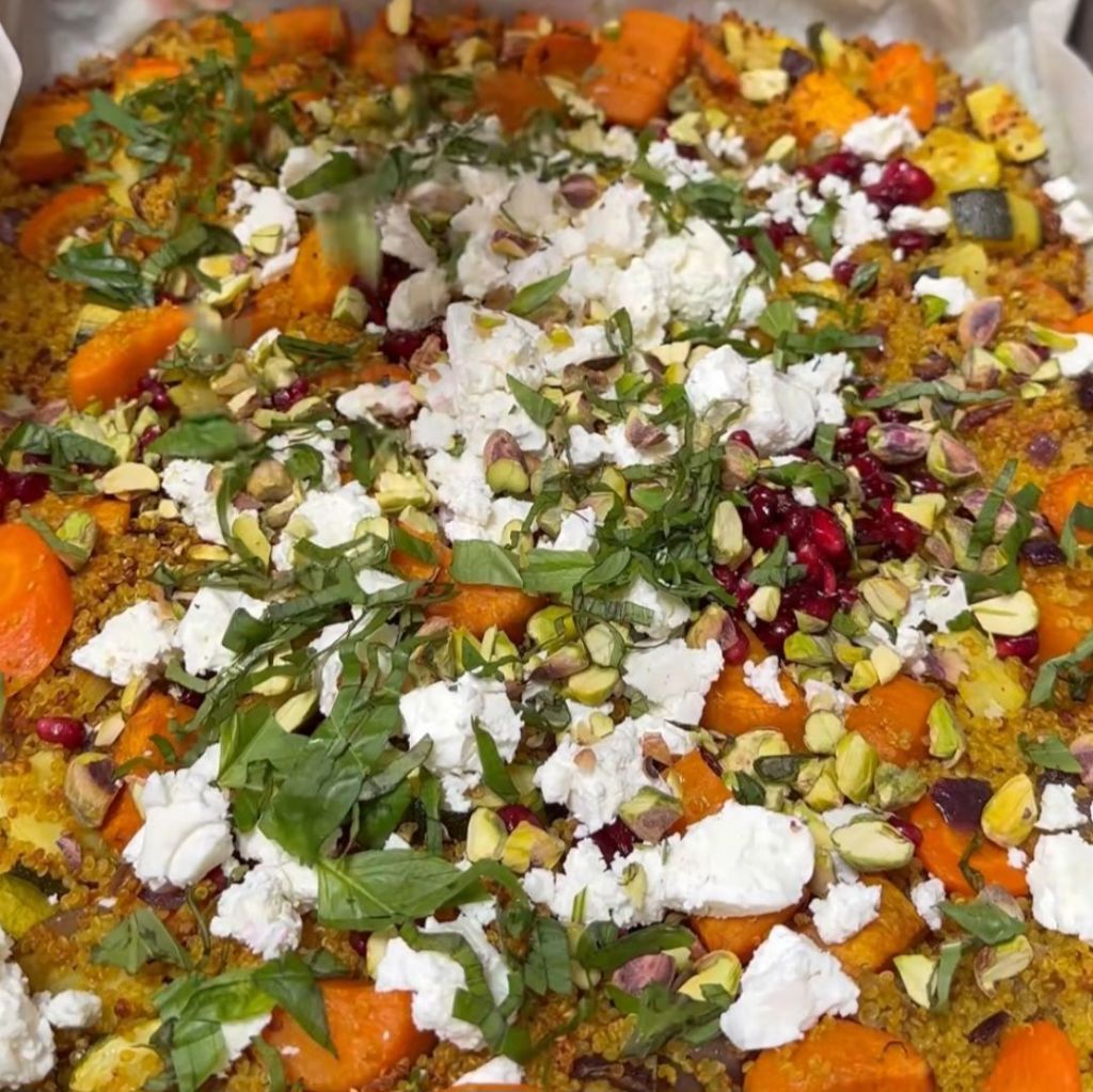 Étaler le quinoa cuit sur une plaque allant au four, ajouter les légumes coupés en petits morceaux. Assaisonner avec le paprika, le curcuma, sel et poivre. Arroser de balsamique et d’huile d’olive. Mélanger. Enfourner 40min. Remuer régulièrement.