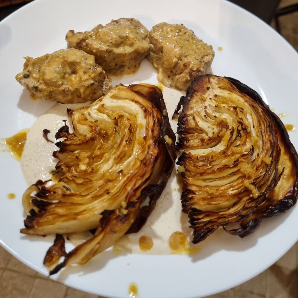 Dans une assiette verser 2 cuillères de sauce tahin, déposer 2 tranches de chou braisé et arroser de quelques gouttes de beurre pimenté.