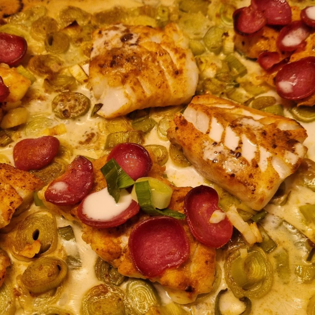 Rincer le cabillaud, le sécher soigneusement et le déposer sur les rondelles de poireaux. Ajouter si envie des lamelles de chorizo ou de saucisse sèche au piment. Saupoudrer d’épices, saler et poivrer.