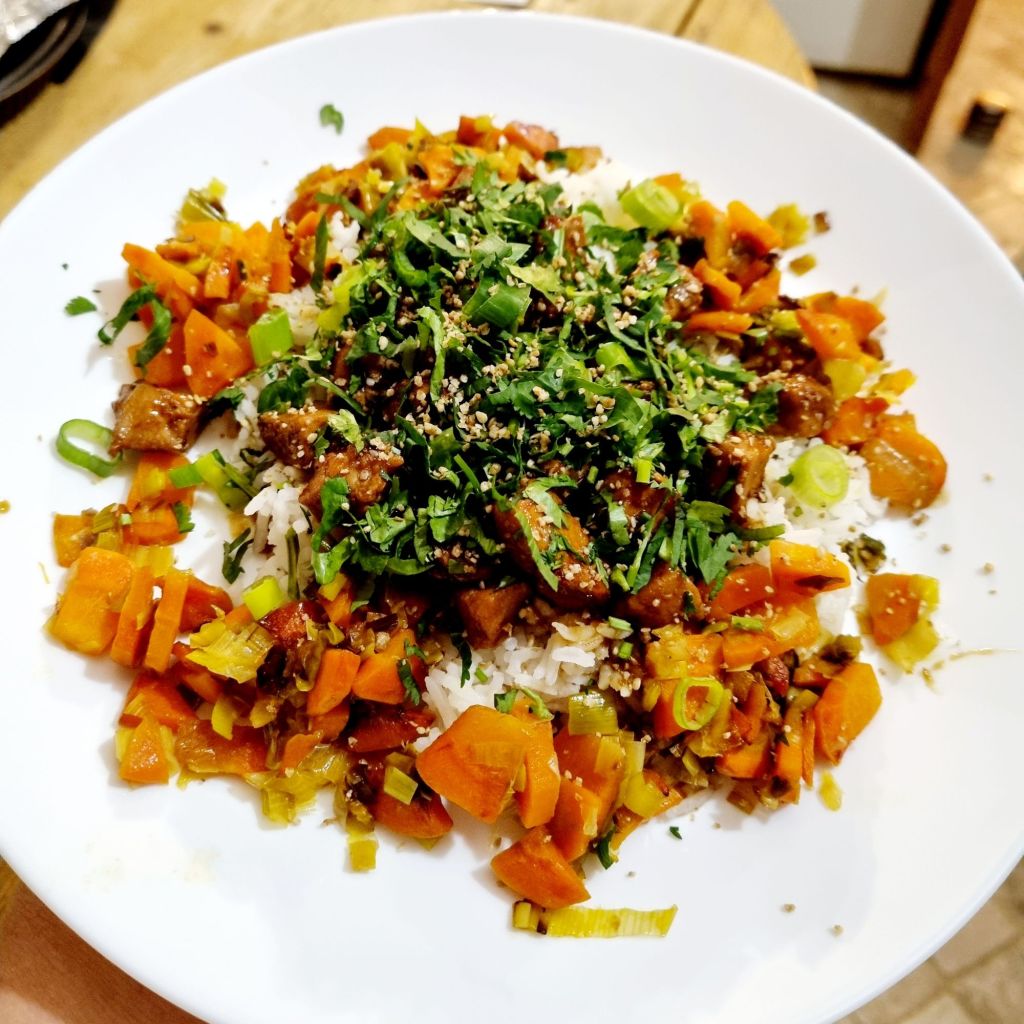 Servez le riz dans les assiettes, puis les légumes et enfin le porc au caramel. Saupoudrez de coriandre, du vert de la cébette et de gomasio.