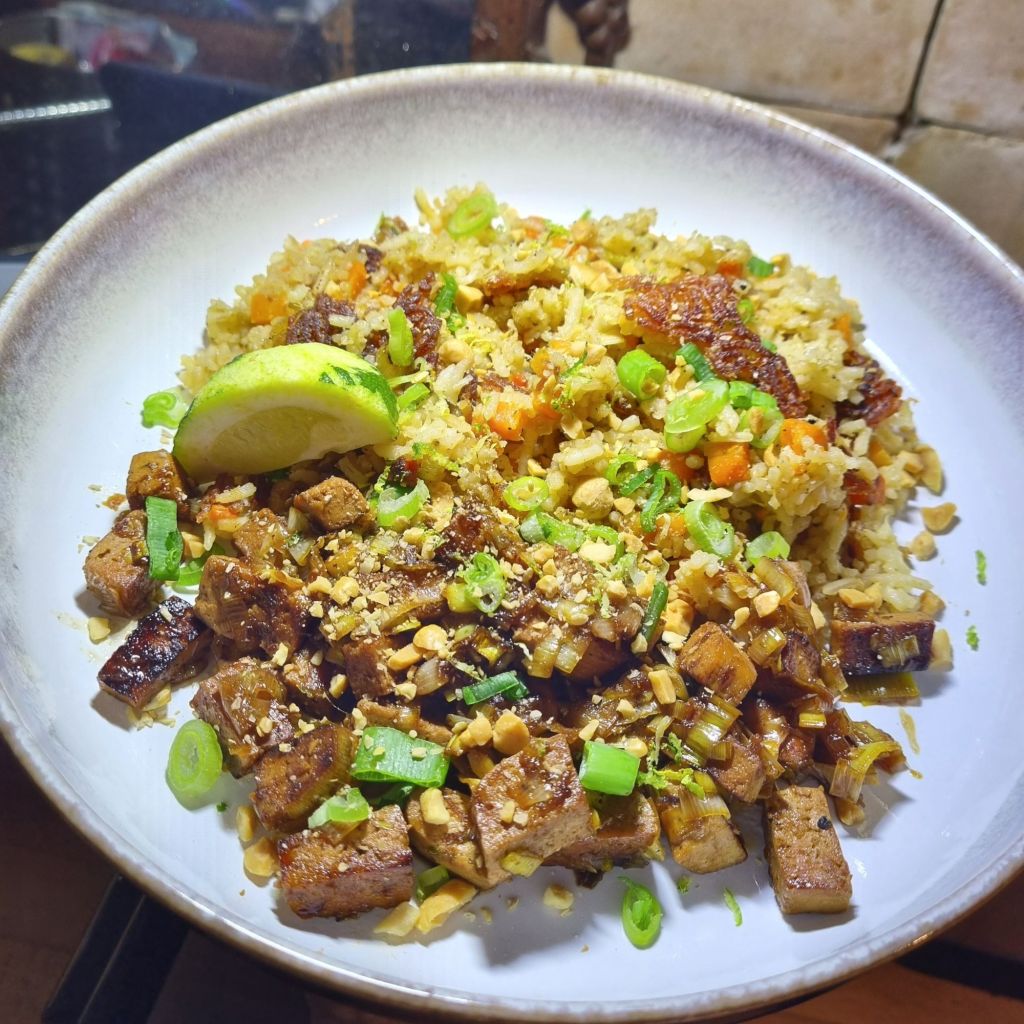 Couvrez et faites mijoter 15 min, jusqu’à ce que le riz ait absorbé tout le liquide et soit cuit. Salez et poivrez. Baissez le feu et laissez doucement 30min, le temps que le fond du riz gratine et croustille. - Faites chauffer un filet d’huile de tournesol dans une poêle à feu moyen-vif. Faites-y caraméliser le tofu 2 min (réservez la marinade).