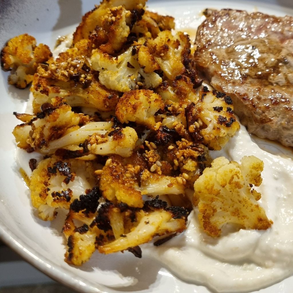 Dans une assiette verser 2 cuillères de sauce tahin, déposer le chou- fleur et arroser de quelques gouttes d’huile pimentée.