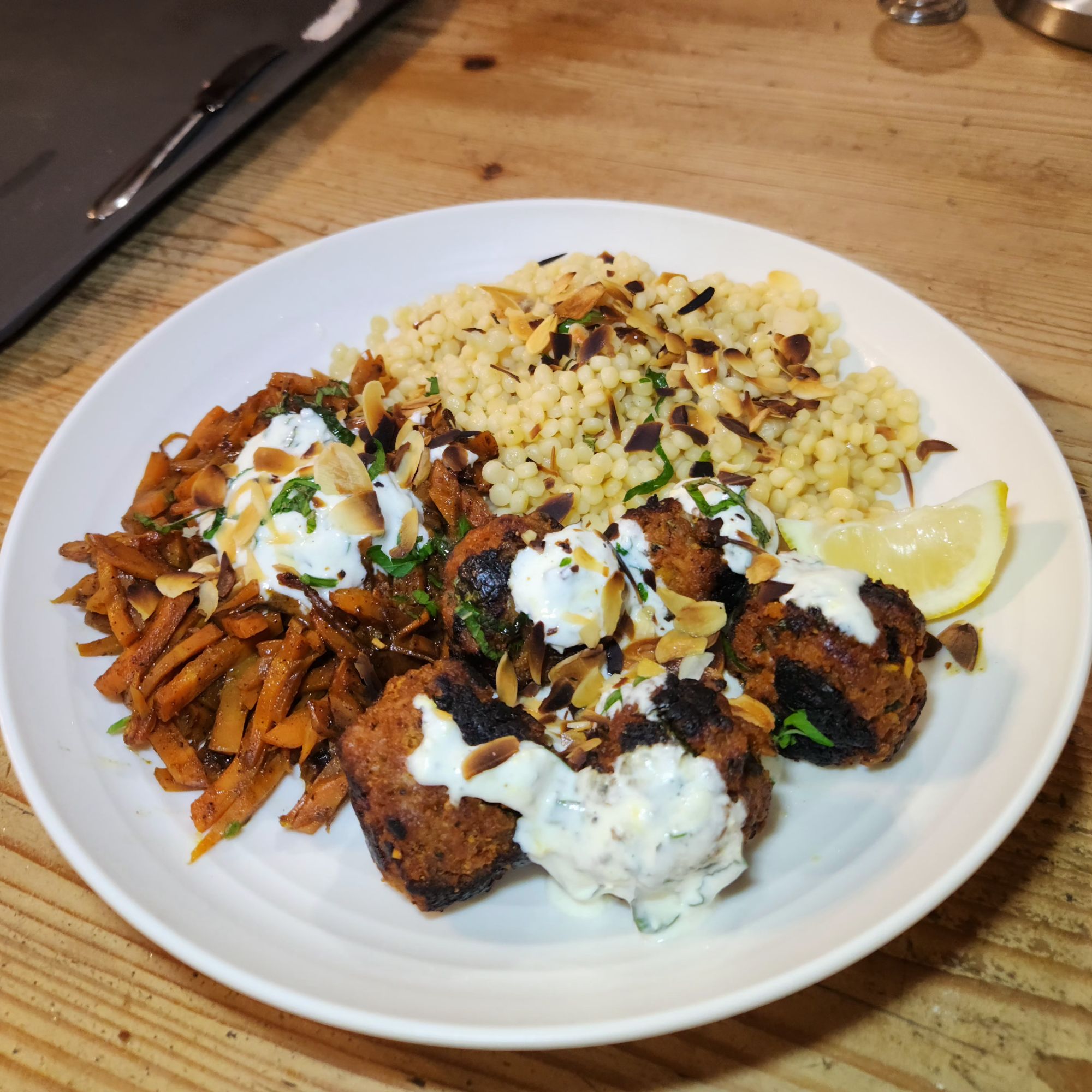 Dans des assiettes creuses, disposez les boulettes et les carottes d’un côté et le couscous perlé de l’autre.