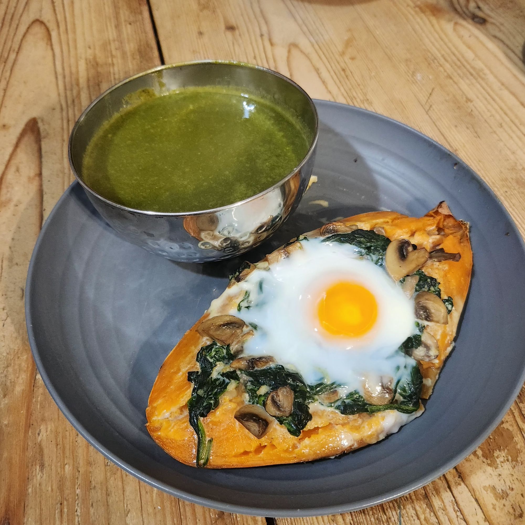 Préchauffer le four à 200°. Couper les patates douces en 2 et les creuser. Placer dans le trou, 1CS de sauce champignons, crème, épinards et casser 1 œuf.