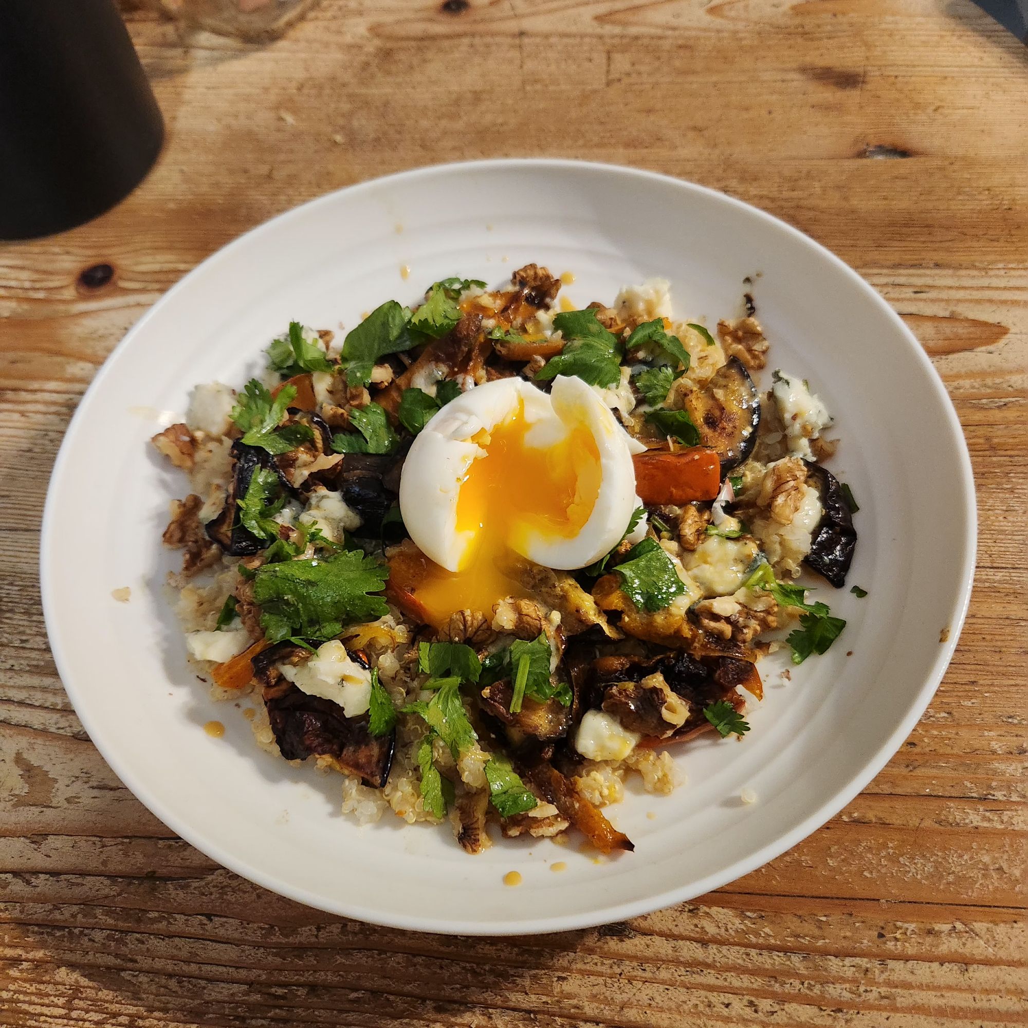 Placer quinoa et légumes rôtis sur chaque assiette. Couper le roquefort en dés. Emietter les noix. Disposer le tout sur le dessus, verser la vinaigrette à l’orange, ciseler un peu de coriandre sur le dessus, saler et poivrer, déguster.