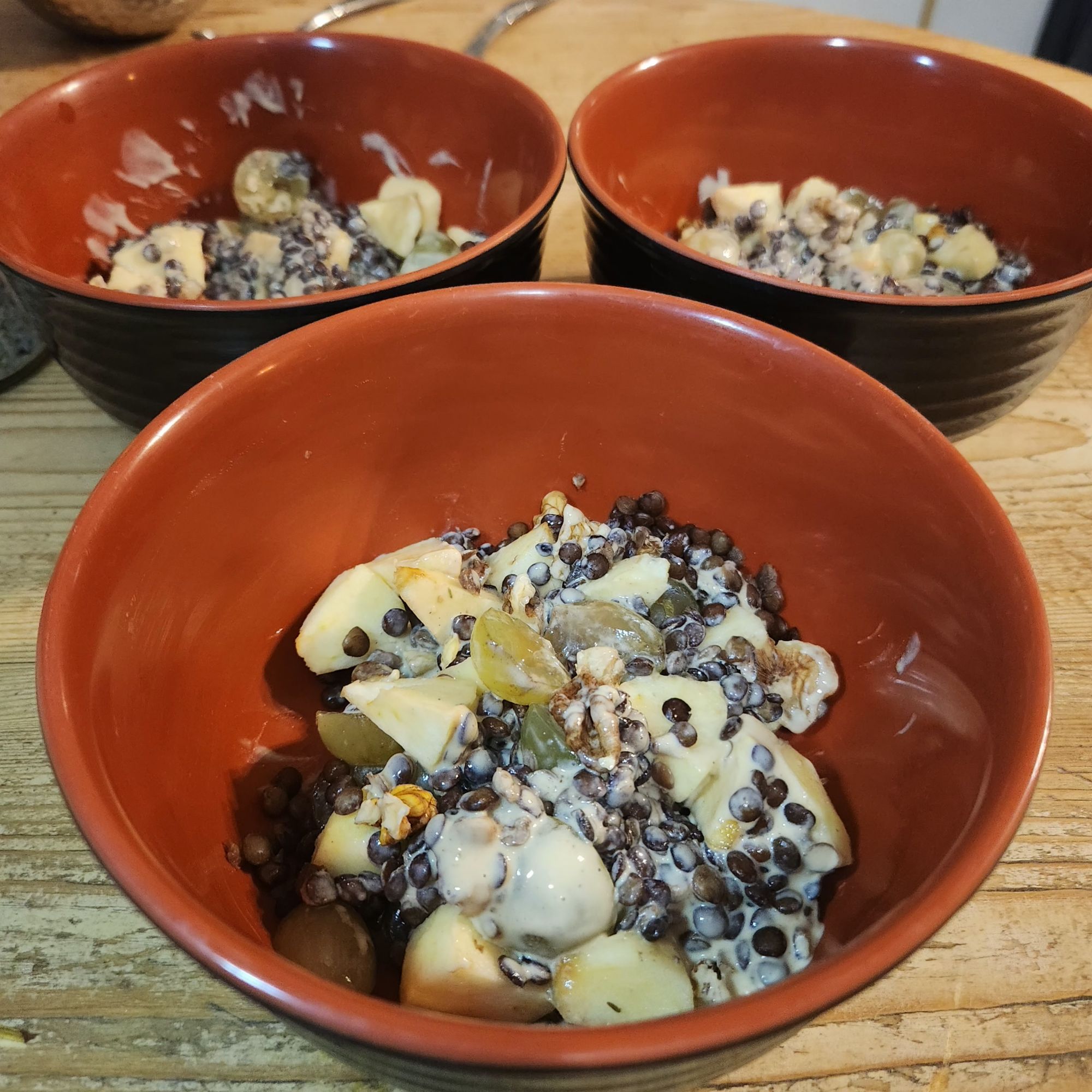 Découper les pommes en petits morceaux, couper les grains de raisin en 2, ôter les pépins, concasser les cerneaux de noix grossièrement. Répartir dans des bols.