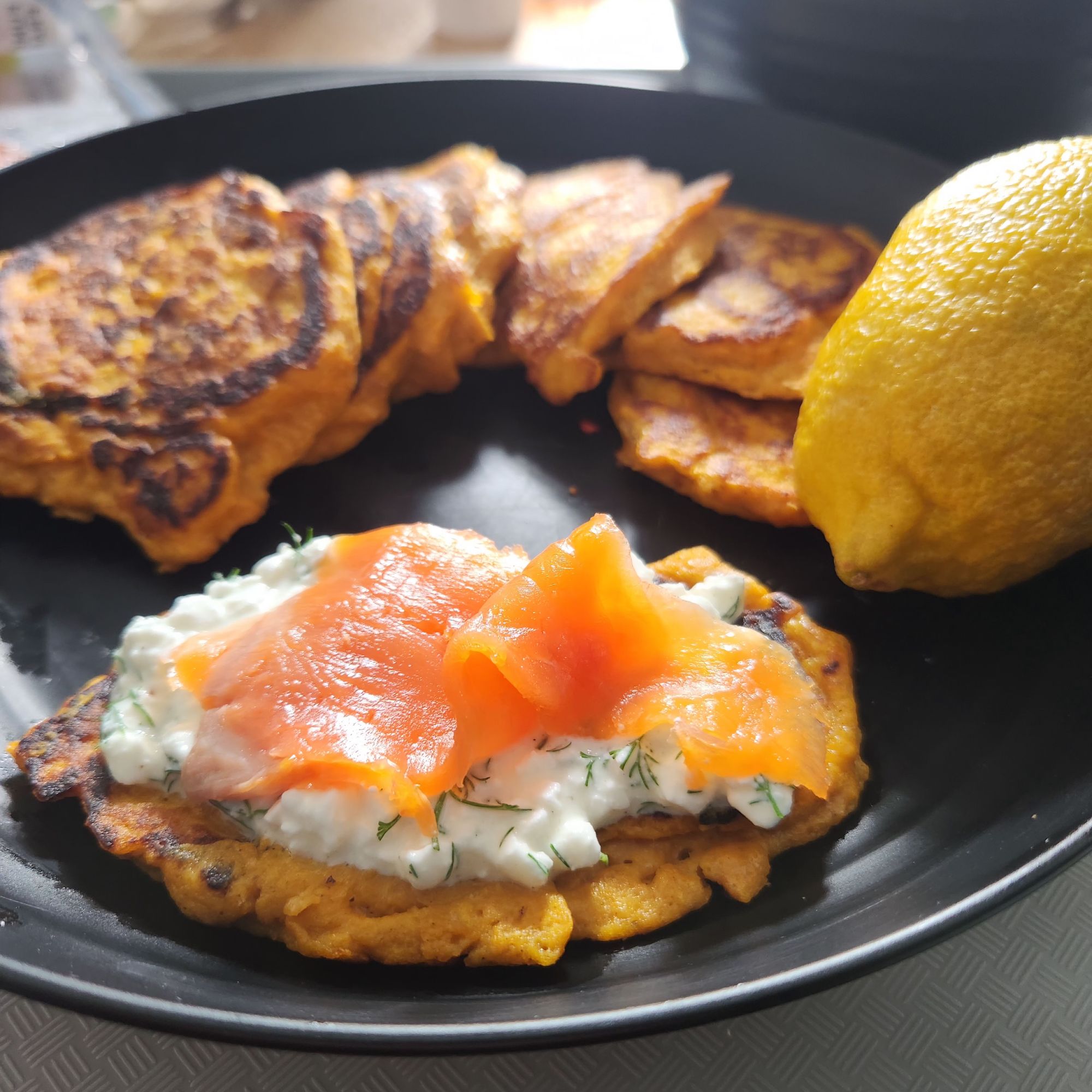 Dans une poêle chaude et huilée, faire des petits tas de la purée de patate douce et laisser dorer 2 minutes de chaque côté en appuyant un peu dessus pour faire des blinis.