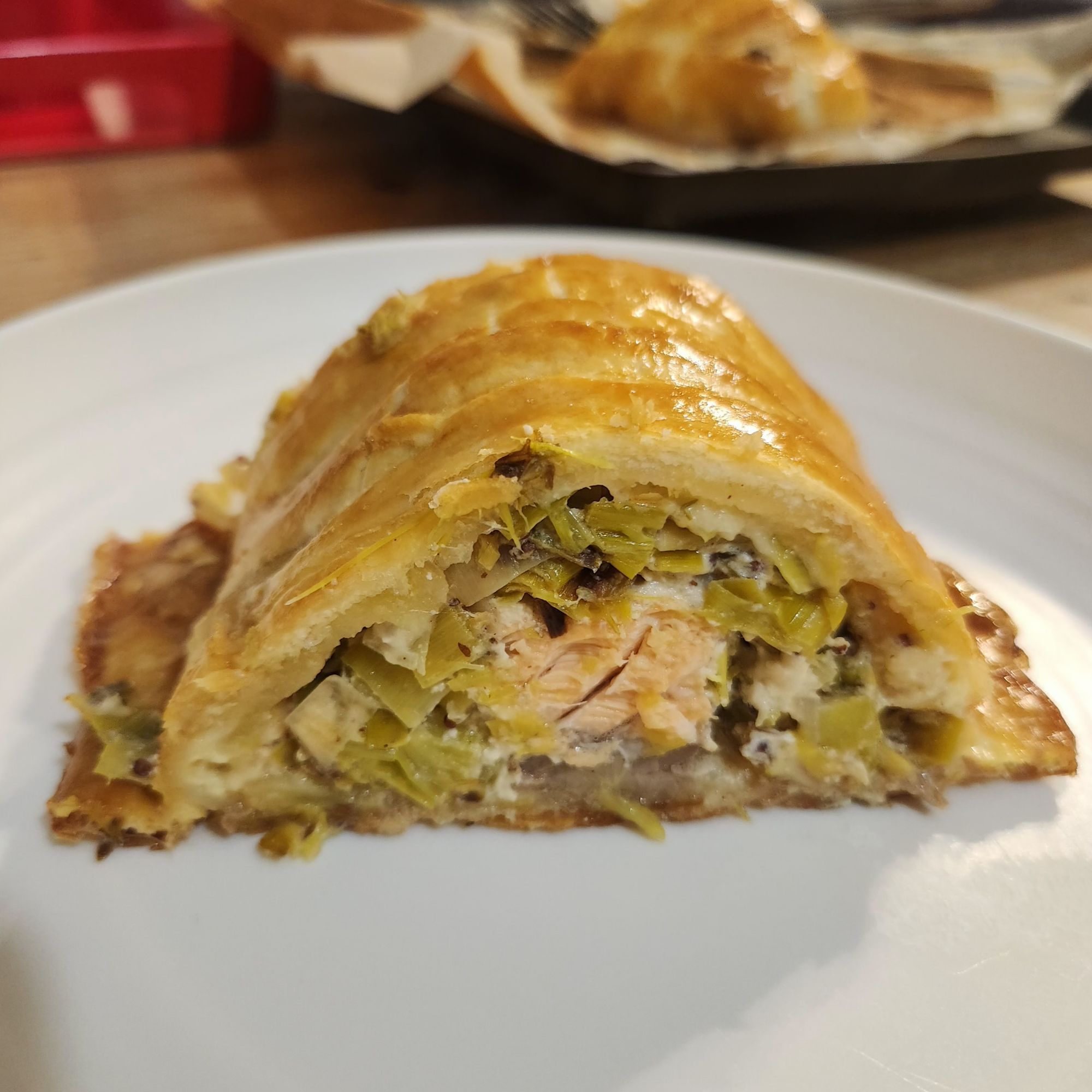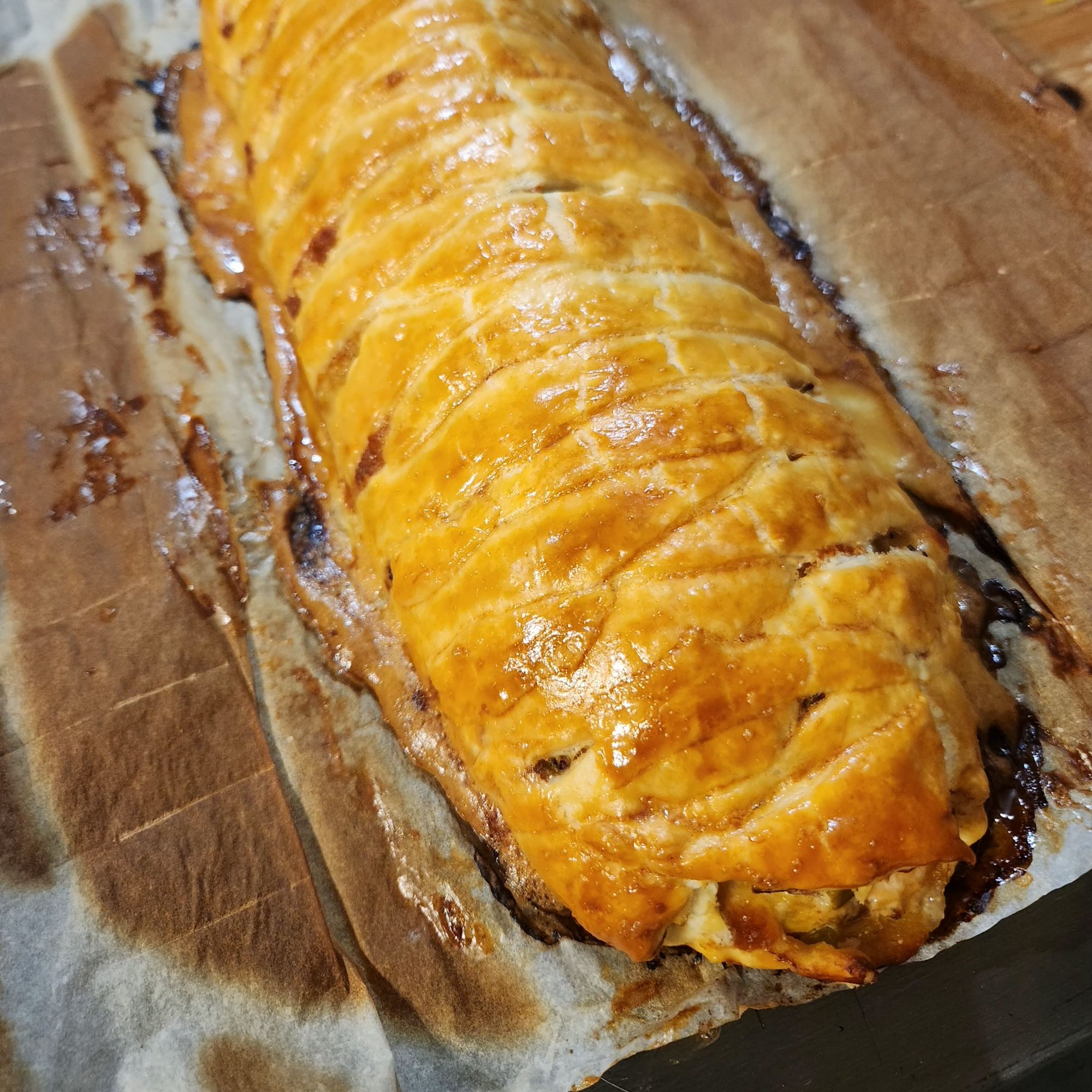 Découper la pâte en lanières de part et d’autre de ce tronçon central. Refermer le feuilleté en alternant une lanière de droite sur une lanière de gauche, tout du long. Dorer au jaune d’œuf. Enfourner 30min.