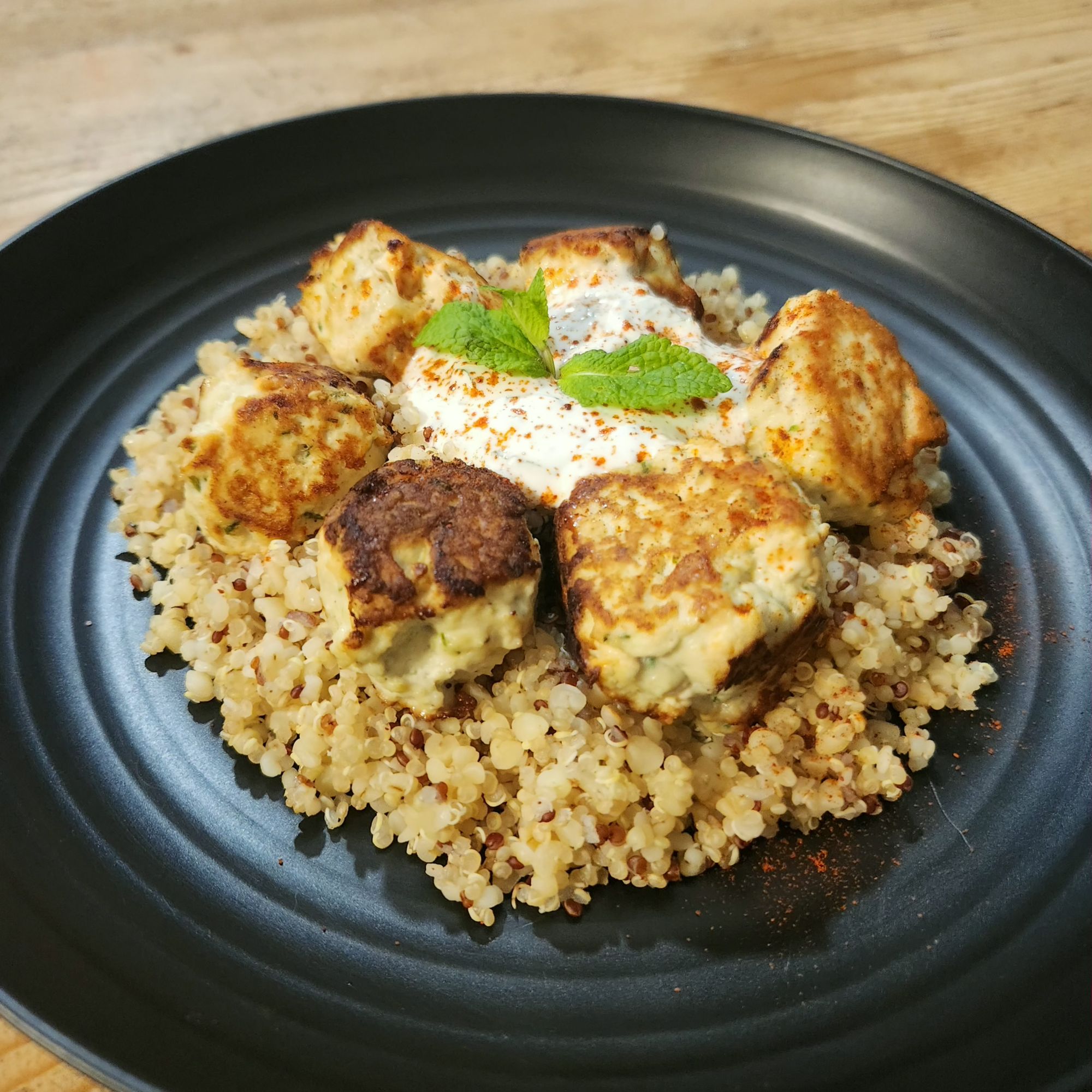 Servir le quinoa en fond d’assiette. Disposer les boulettes sur le dessus avec une grosse cuillère de yaourt. Saupoudrer du paprika sur le dessus.