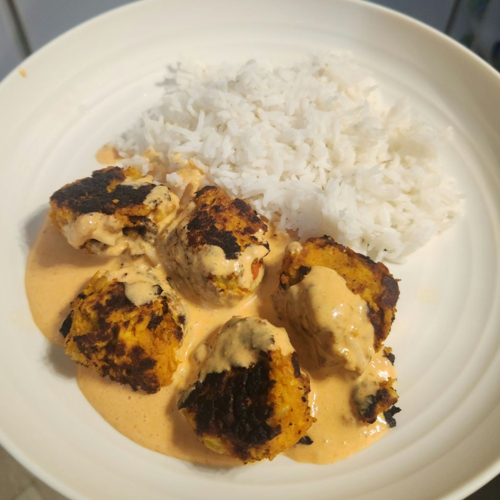 Dresser les boulettes sur des assiettes et napper de sauce au curry. Servir avec du riz basmati.