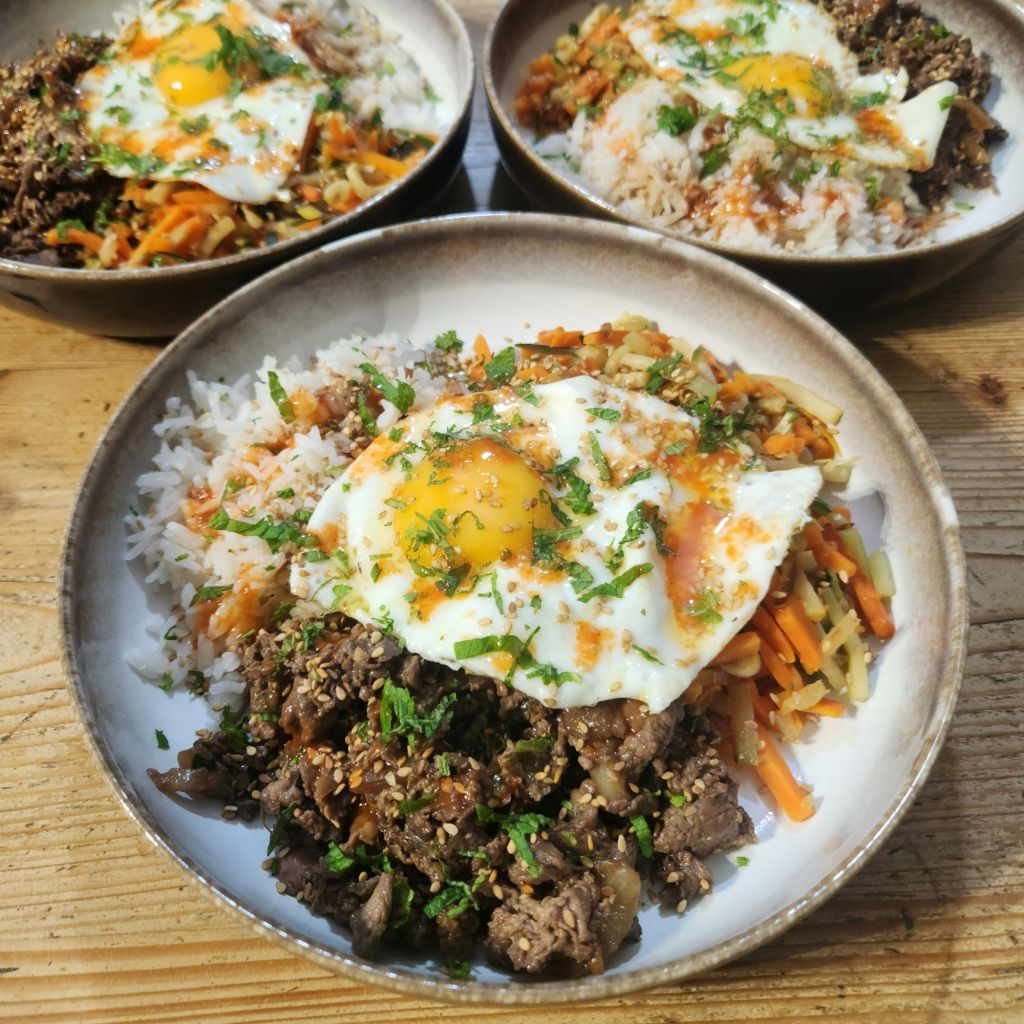Répartissez le riz dans 4 bols ou assiettes creuses et déposez tout autour les légumes, puis la viande et enfin l’oeuf au centre. Saupoudrez de graines de sésame et de menthe ciselée puis ajoutez 1CS de sauce sésame-piment dans chaque bol avant de déguster.