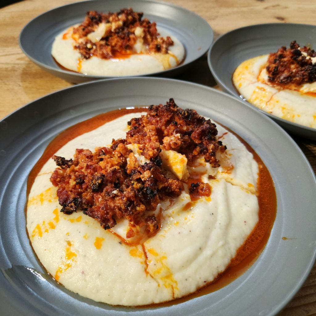 Une fois le chou-fleur et les pommes de terre cuits, égouttez-les et écrasez-les dans un saladier avec la crème fraîche. Mélangez jusqu’à obtenir une purée lisse et homogène. Salez, poivrez et ajoutez une pincée de sumac.